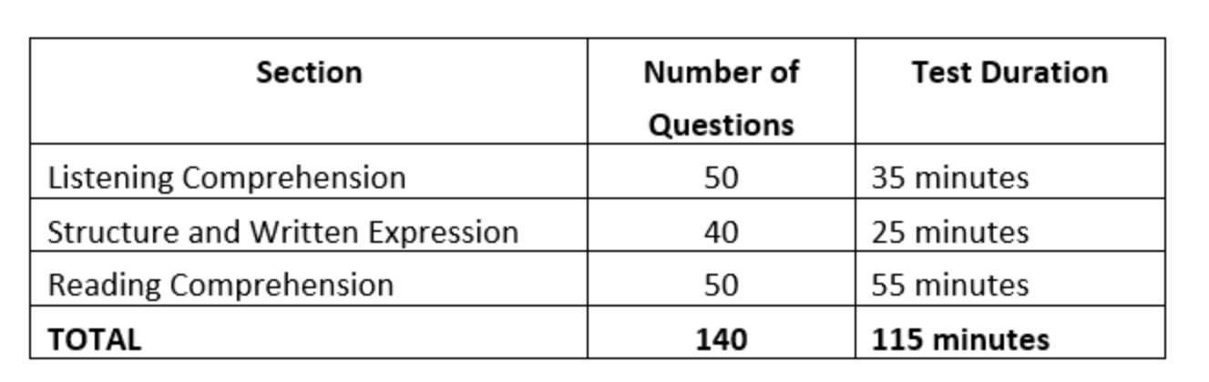 Kemampuan yang diujikan terdiri dari tiga bagian: Listening Comprehension, Structure and Written Expression, dan Reading Comprehension.